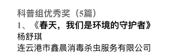 連云港市鑫晨消毒殺蟲(chóng)服務(wù)有限公司楊舒琪《春天,我們是環(huán)境的守護(hù)者》獲得2021年“衛(wèi)康杯”征文賽科普組優(yōu)秀獎(jiǎng)。